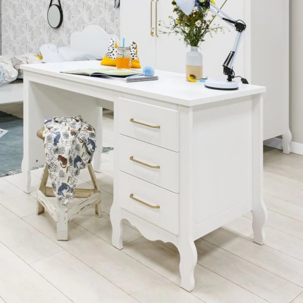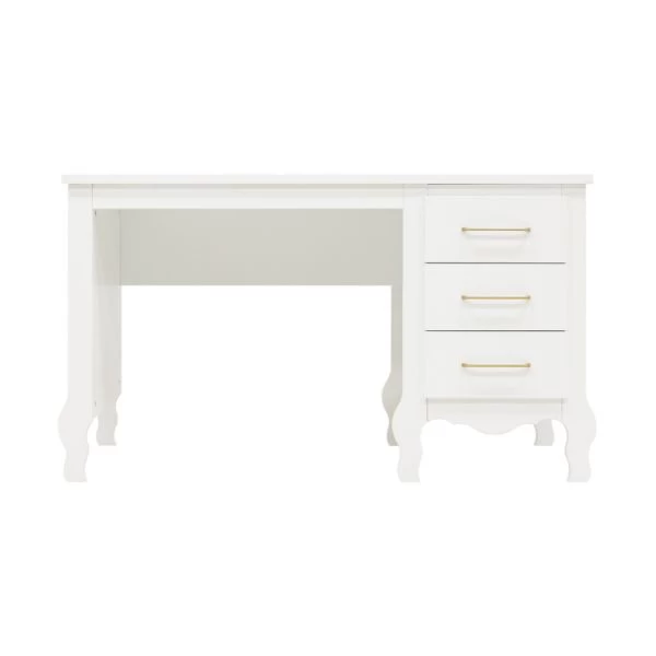 Het Bopita Elena Bureau Wit beschikt over 3 ruime lades met voldoende opbergruimte. De lades zijn voorzien van ranke, matte en goudkleurige handgrepen. Verder is het bureau gemaakt van hoogwaardig MDF materiaal en voorzien van een stijlvol design. Perfect te combineren met andere producten van de Elena serie van Bopita.