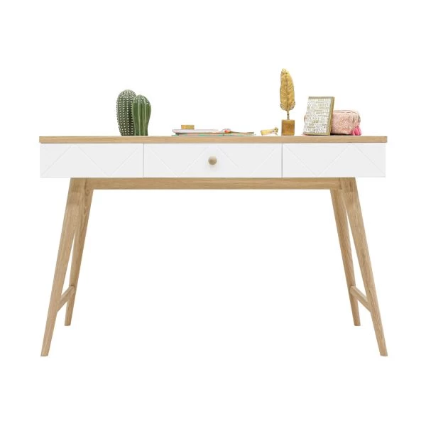 Het Bopita Paris Bureau Wit / Eiken is een praktisch en stijlvol bureau. Het Bureau heeft een unieke uitstraling door de diagonale groeven en eiken accenten. Daarnaast heeft het bureau een breed bureaublad en beschikt het over een handige lade. Het bureau is leuk te combineren met andere meubels van de Bopita Paris serie. Verder is het bureau gemaakt van hoogwaardig MDF en eiken materiaal.