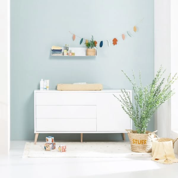 De Europe Baby Sterre / Raw Babykamer Wit is een stijlvolle kamer gemaakt van hoogwaardig materiaal. Het ledikant wordt geleverd inclusief lattenbodem. Daarnaast is het ledikant in 3 standen verstelbaar. Verder heeft de Sterre commode 3 extra ruime lades en aan de rechterzijde één hoge lade met een hanggedeelte. De commode is praktisch in gebruik door het soft close systeem waarmee de lades zijn uitgerust. Perfect te combineren met andere producten van de Sterre serie.